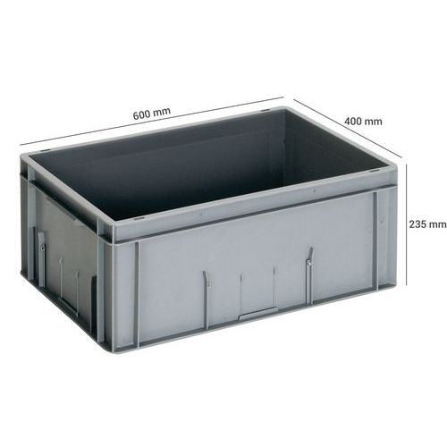 Stohovateľný prepravný kontajner európskeho štandardu. So zapustenými úchytmi a dvoma držiakmi štítkov. Pevná základňa a boky.