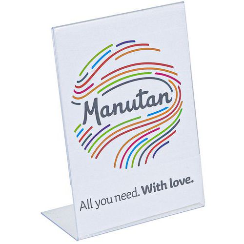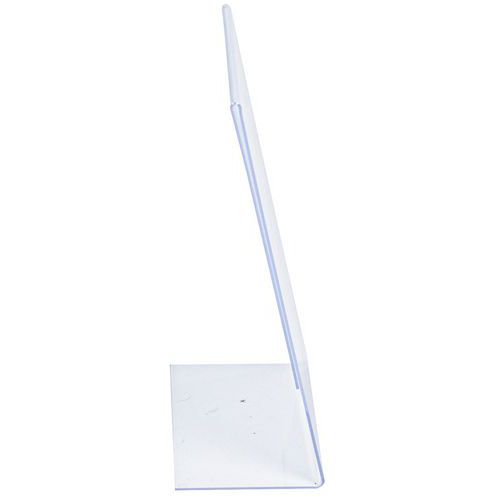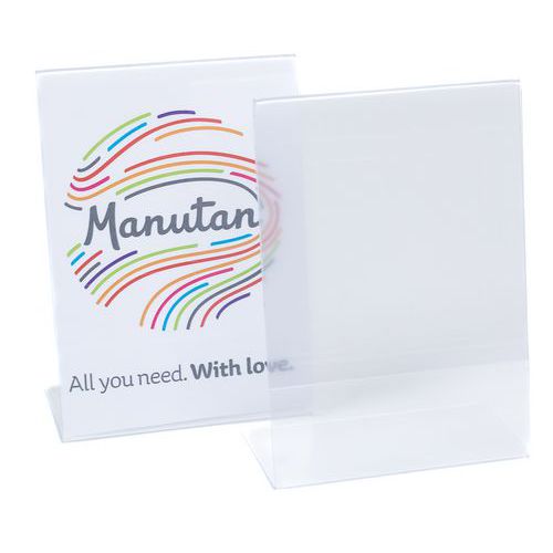 - Bezfarebné stolové stojančeky L na prospekty s orientáciou na výšku.