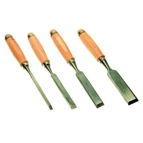 - Štvordielna súprava dlátok. Rukoväť z bukového dreva má úderovú plochu s kovovým krúžkom zvyšujúcim pevnosť.