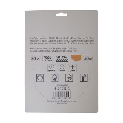 | Názov produktu | TOPTRADE kotúč pílový, na drevo, s SK plátkami, 24 zubov, 160 x 2,2 x 20/16 mm |