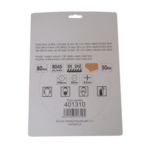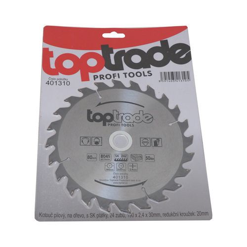 | Názov produktu | TOPTRADE kotúč pílový, na drevo, s SK plátkami, 24 zubov, 190 x 2,4 x 30/20 mm |