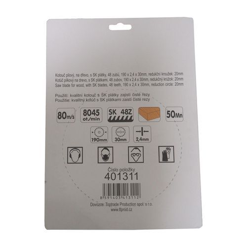 | Názov produktu | TOPTRADE kotúč pílový, na drevo, s SK plátkami, 48 zubov, 190 x 2,4 x 30/20 mm |
