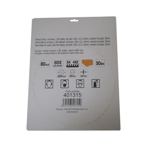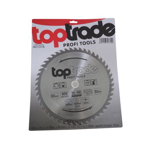 | Názov produktu | TOPTRADE kotúč pílový, na drevo, s SK plátkami, 48 zubov, 305 x 3,2 x 30/20 mm |