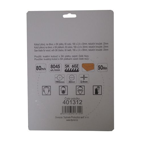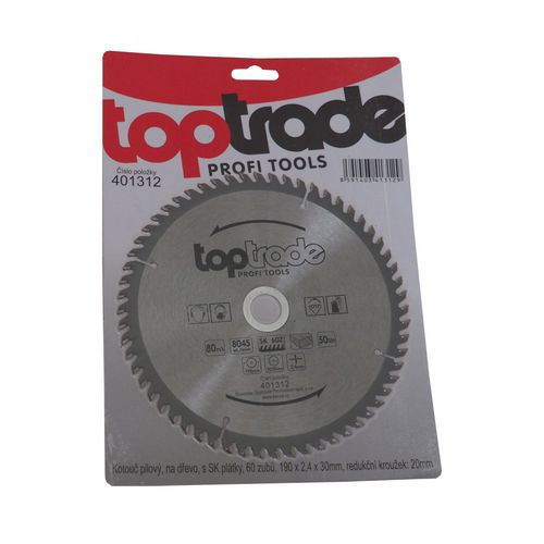 | Názov produktu | TOPTRADE kotúč pílový, na drevo, s SK plátkami, 60 zubov, 190 x 2,4 x 30/20 mm |