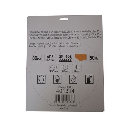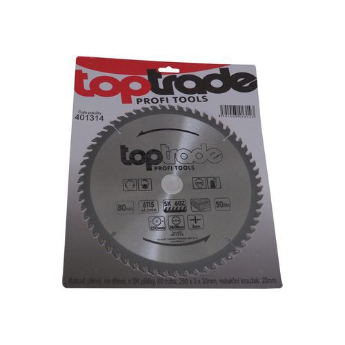 | Názov produktu | TOPTRADE kotúč pílový, na drevo, s SK plátkami, 60 zubov, 250 x 3 x 30/20 mm |