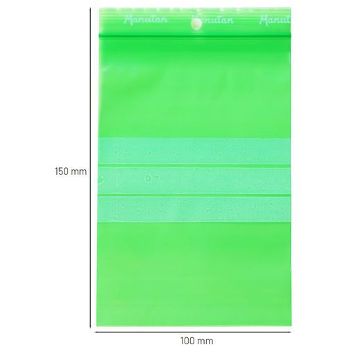 Uzatvárateľné recyklované vrecká so zipsom Manutan Expert, zelené, 100 x 150 mm, 100 ks