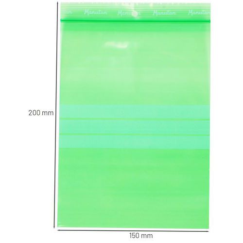 Uzatvárateľné recyklované vrecká so zipsom Manutan Expert, zelené, 150 x 200 mm, 100 ks