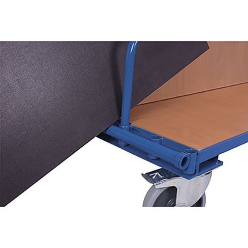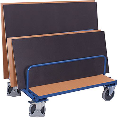 Vozíky na prepravu rozmerných tabuľových bremien. Konštrukcia zo zváranej ocele, ložná plocha z MDF dosky. 7 pozícií pre umiestnenie oporných rúrok, vzdialenosť medzi rúrkami 95 mm. Pojazd zaisťujú dve pevné a dve otočné kolesá s brzdou. Šedá kolesá z termoplastickej gumy nezanechávajúce stopy na plastovom ráfiku s presnými guličkovými ložiskami alebo elastické celogumové kolesá na liatom hliníkovom ráfiku s presnými guličkovými ložiskami. Povrchová úprava rámu práškovou farbou podľa stupnice RAL. Odolné proti nárazu a poškriabaniu.