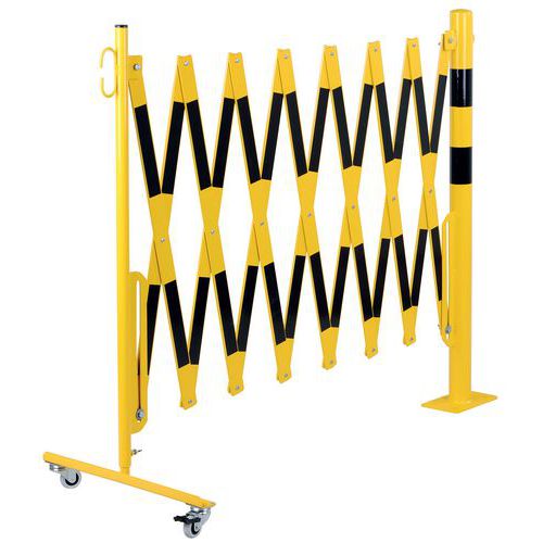 Výsuvná kovová zábrana na kolieskach Dancop, okrúhly stĺpik, čierna/žltá, dĺžka 400 cm
