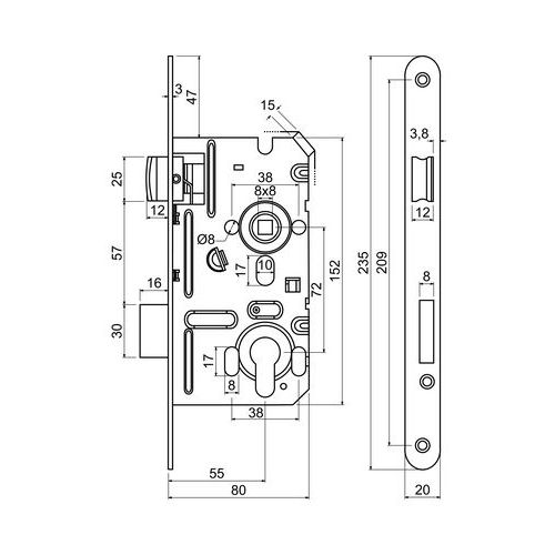Zadlabacie zámky pre cylindrickú vložku, PZ, pravý, 20mm