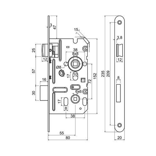 Zadlabacie zámky pre WC kľučku, 20mm, ľavý