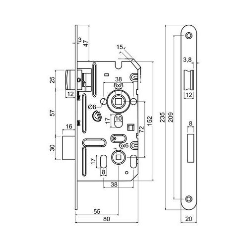 Zadlabacie zámky pre WC kľučku, 20mm, pravý