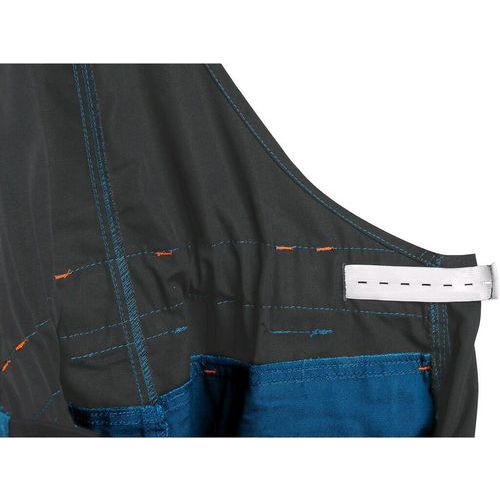 Pánske montérkové nohavice s náprsenkou, náprsné vrecko s chlopňou, pás s pútkami na opasok, v zadnej časti guma s gombíkom na prispôsobenie veľkosti, predné klinové vrecká, multifunkčné vrecká na oboch stranách, kolená zosilnená materiálom 600D polyester s možnosťou vloženia kolenných výsev vystužená materiálom 600D polyester, traky s gumou vzadu, reflexné doplnky. Odporúčané použitie: stavebníctvo, strojárstvo, ľahký priemysel, automobilový priemysel, logistika, skladová manipulácia, špedícia, autoservisy, údržba, montáže, poľnohospodárstvo, záhrada, hobby. Vrchný materiál: 65% polyester 35% bavlna Reflexné doplnky: Áno OEKO-TEX® STANDARD 100: Áno Veľkosť: 46-64