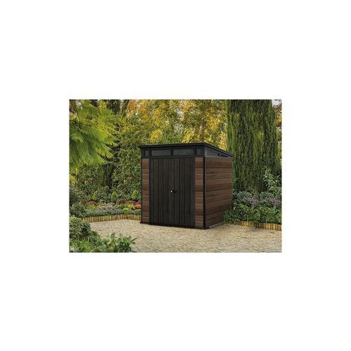 Plastový záhradný domček Horizontal v hnedom vyhotovení je bezúdržbový a je vyrobený z jedinečného materiálu Decocoat, ktorý je inšpirovaný moderným vzhľadom v imitácii dreva.