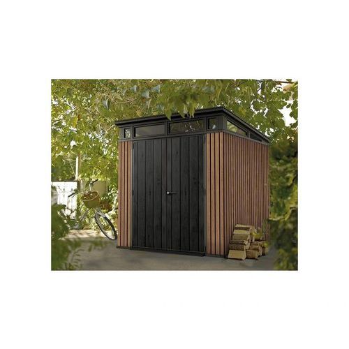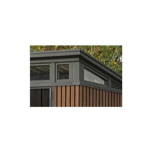 Bezúdržbový plastový záhradný domček Vertical v hnedom vyhotovení je vyrobený z jedinečného materiálu Decocoat, ktorý je inšpirovaný moderným vzhľadom v imitácii dreva.