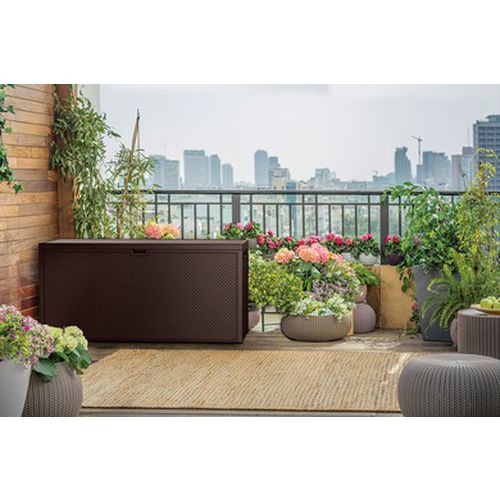 Plastový box na ukladanie záhradného náčinia, podušiek či hračiek. Súčasťou sú kolieska a bočné rukoväti pre lepšiu manipuláciu. Jednoduchá montáž bez využitia náradia. Vhodný do exteriéru aj interiéru.