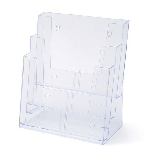 Plastové stojančeky na letáky, brožúry, propagačné materiály a pod. Tri oddiely v stupňoch za sebou orientované na výšku. Možnosť upevnenia na stenu. Stojanček sa štandardne dodáva bez potlače.