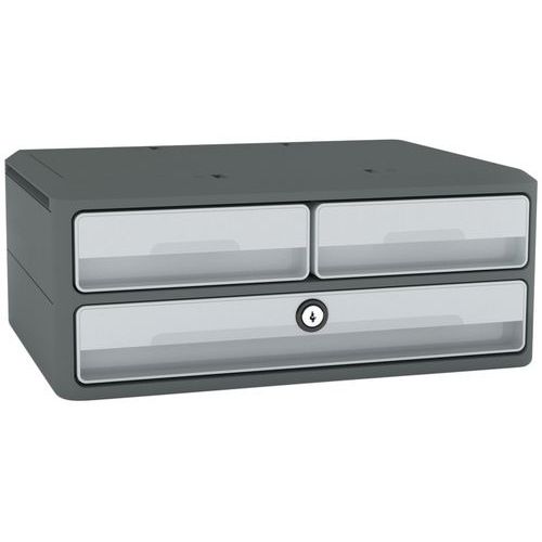 Jednotky Moov'Up s dvoma menšími zásuvkami a jednou veľkou zásuvkou na uloženie čohokoľvek od kancelárskych potrieb po dokumenty alebo tablety. Zásuvky je možné indexovať a prispôsobiť pomocou fixky na vodnej báze. Moduly sú mimoriadne robustné a je možné ich použiť ako stojan na obrazovku (do 5 kg). Zásuvky je možné uzamknúť a je tu otvor pre montáž bezpečnostného kábla proti krádeži. Vďaka štyrom vstavaným zárezom je možné bezpečne stohovať niekoľko jednotiek na seba.