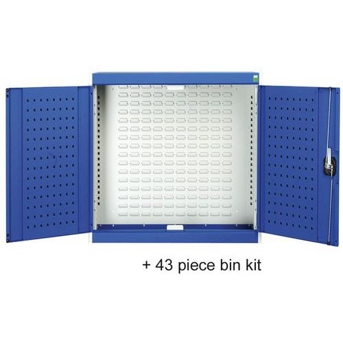 Závesná kovová skrinka s perforáciou a sadou plastových boxov na uloženie náradia. Perforovaný zadný panel skrinky na zavesenie plastových boxov (typ louvre) a dvierka skrinky s perforovanou vnútornou stranou na umiestnenie držiakov náradia (typ perfo). Robustná zváraná oceľová konštrukcia 1 tona, povrchová úprava práškovým lakom. Zamykanie cylindrickým zámkom s dvoma kľúčmi. Sada 23 boxov obsahuje 20 x plastový box č. 2 (vx š xh) 8,3 x 10,3 x 16,5 cm: 5 x žltý, 10 x červený, 5 x modrý a plastový box č. 3 (vx š xh) 12,5 x 14,5 x 24 cm: 3 x žltý. Sada 33 boxov obsahuje 28 x plastový box č. 2 (vx š xh) 8,3 x 10,3 x 16,5 cm: 7 x žltý, 7 x červený, 14 x modrý a plastový box číslo 3 (vx š xh) 12,5 x 14,5 x 24 cm: 5 x žltý. Sada 43 boxov obsahuje 28 x plastový box č. 2 (vx š xh) 8,3 x 10,3 x 16,5 cm: 7 x žltý, 7 x červený, 14 x modrý a 15 x plastový box č. 3 (vx š xh) 12,5 x 14,5 x 24 cm: 5 x žltý, 5 x červený, 5 x modrý.