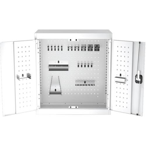 Závesná kovová skrinka s perforáciou a sadou držiakov na náradie. Zadná časť skrinky a vnútorná časť dverí sú opatrené perforovanými panelmi na uchytenie držiakov náradia (typ perfo). Robustná zváraná oceľová konštrukcia s nosnosťou až do 1 tony, povrchová úprava práškovým lakom. Zamykanie cylindrickým zámkom s dvoma kľúči. Sada 20 držiakov na náradie obsahuje: 1 x držiak imbusových kľúčov, 1 x držiak skrutkovačov, 1 x držiak vrtákov, 1 x držiak kľúčov, 1 x držiak na pílu, 5 x dvojitý háčik Ø6 x 75 mm, 5 x klip na náradie Ø 13 mm, 5 x jednoduchý háčik Ø6 x 25 mm. Sada 40 držiakov na náradie obsahuje: 1 x držiak imbusových kľúčov, 1 x držiak skrutkovačov, 1 x držiak vrtákov, 1 x držiak kľúčov, 1 x držiak na pílu, 5 x dvojitý háčik Ø6 x 150 mm, 5 x dvojitý háčik Ø6 x 75 mm, 5 x klip na náradie Ø 13 mm, 5 x klip na náradie Ø 25 mm, 5 x jednoduchý háčik Ø6 x 25 mm, 5 x jednoduchý háčik Ø6 x 50 mm, 5 x držiak klieští š. 55 mm.