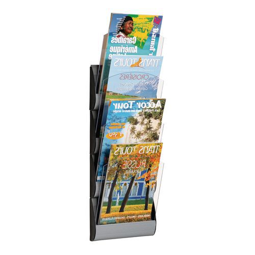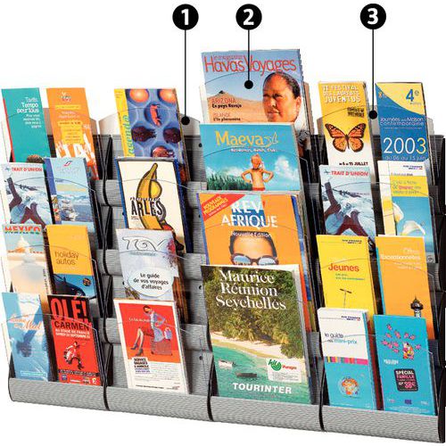Nástenný držiak s priehľadnými priehradkami prehľadne zobrazí vaše reklamné brožúry. Vysoká kapacita vďaka šírke priehradky 2,3 cm. Jednoduché pripevnenie jednotky na stenu pomocou praktického zaklapávacieho systému.