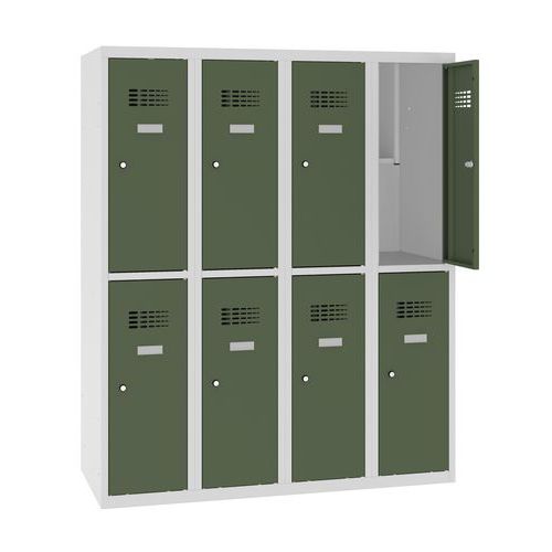 Znížený školský šatník, 8 oddielov, 300 mm, sivá/zelená, cylindrický zámok