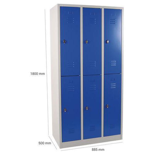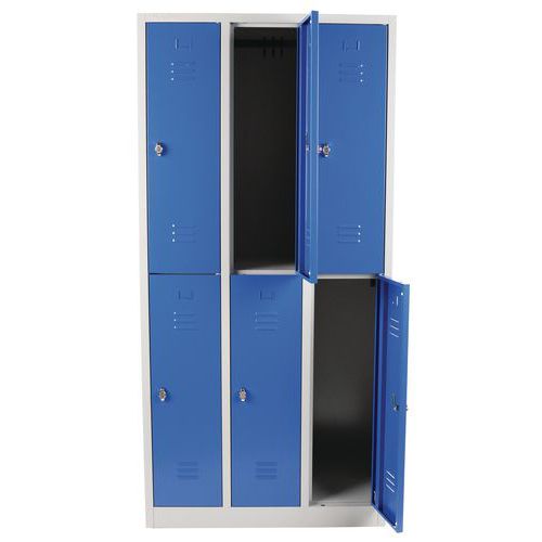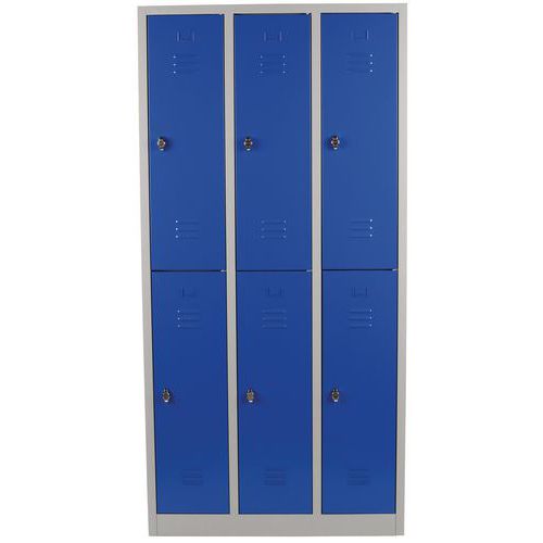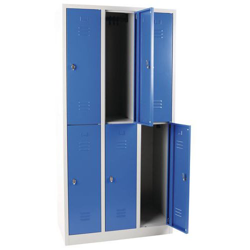 Zváraná šatníková skriňa Manutan Expert, 6 oddielov, na sokli, bez zámku, šedá / modrá