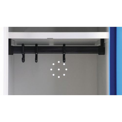 Súčasťou balenia je polica, tyč na vešiaky a háčik na odevy. Dodáva sa s dvoma kľúčmi ku každému boxu.