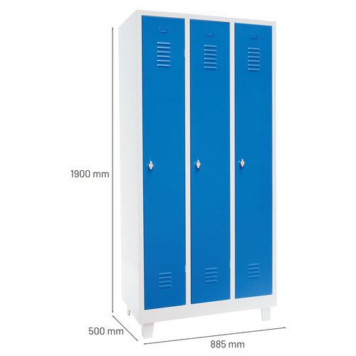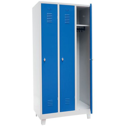 Zváraný šatník Manutan Expert DURO PROFI na nohách, 3 oddiely, sivý/modrý, otočný uzáver
