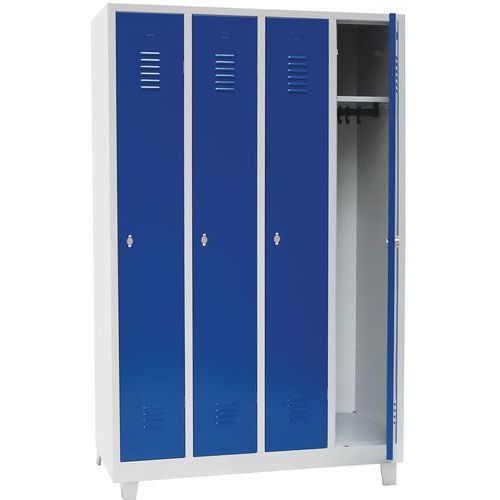 Zváraný šatník Manutan Expert DURO PROFI na nohách, 4 oddiely, sivý/modrý, otočný uzáver