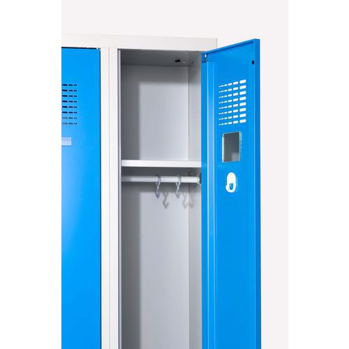 Zvárané šatníky majú odľahčenú konštrukciu a sú vybavené výstuhami zaisťujúcimi dobrú stabilitu. Skrine sa skladajú z dvoch samostatne uzamykateľných oddielov. Dvere sú perforované pre optimálnu ventiláciu a sú umiestnené na vnútorných pántoch. Uzamykanie cylindrickým zámkom s možnosťou výmeny za otočný uzáver (nutné dokúpiť zvlášť). Možnosť umiestnenia štítku s menom v hornej časti dverí. Bezpečnostné pokyny:Nábytok postavte na rovný a plochý povrch. Pripevnite ho k stene alebo k priečke pomocou vhodného upevnenia. Dbajte na správne rozmiestnenie záťaže a neprekračujte maximálne povolené zaťaženie.