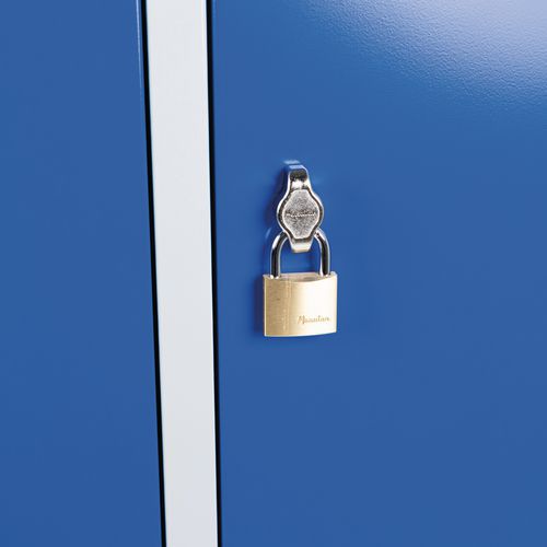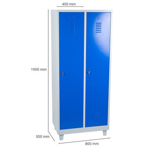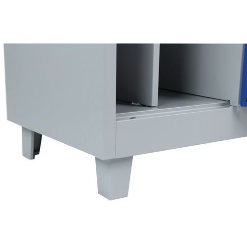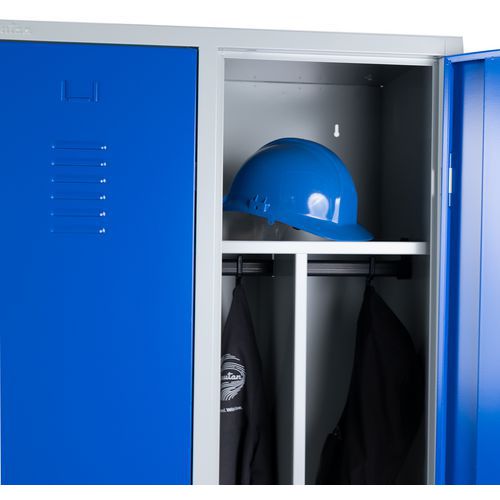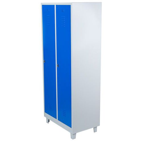 Zváraný šatník s medzistenou Manutan Expert DURO PROFI na nohách, 2 oddiely, sivý/modrý, otočný uzáver