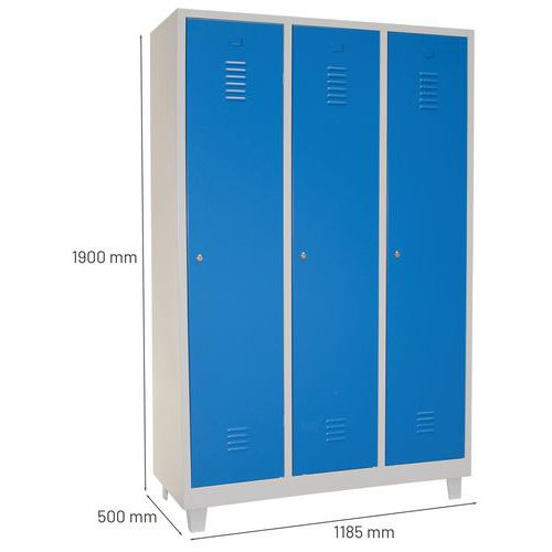 Zváraný šatník s medzistenou Manutan Expert DURO PROFI na nohách, 3 oddiely, sivý/modrý, cylindrický zámok