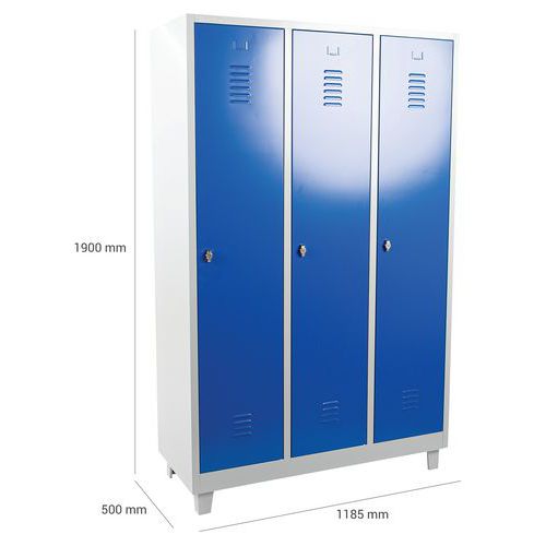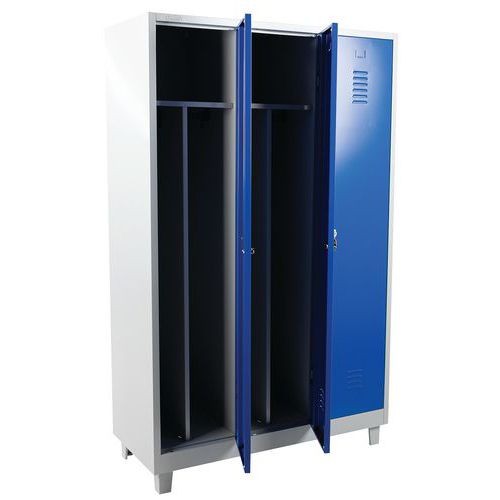 Zváraný šatník s medzistenou Manutan Expert DURO PROFI na nohách, 3 oddiely, sivý/modrý, otočný uzáver