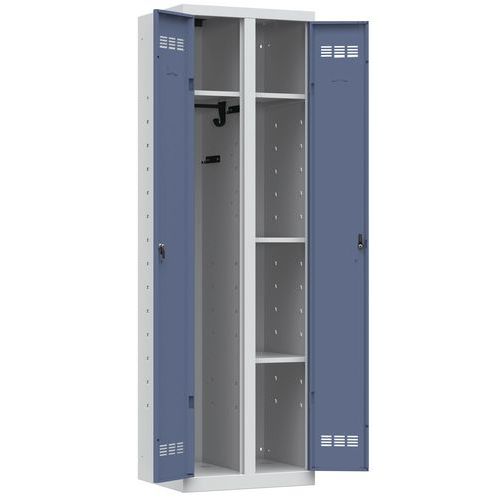 Zváraná viacúčelová skriňa zváraná z oceľového plechu hrúbky 0,7 mm. Vnútorný priestor obsahuje oddiel na odloženie oblečenia (vrátane tyče na vešiaky s háčikmi) a oddiel rozdelený do sekcií na uloženie pomôcok, materiálu a pod. Jednotlivé oddiely sú samostatne uzamykateľné otočným uzáverom na visací zámok (nie je súčasťou dodávky). Ventilácia vo dverách, možnosť umiestnenia štítka s menom.
